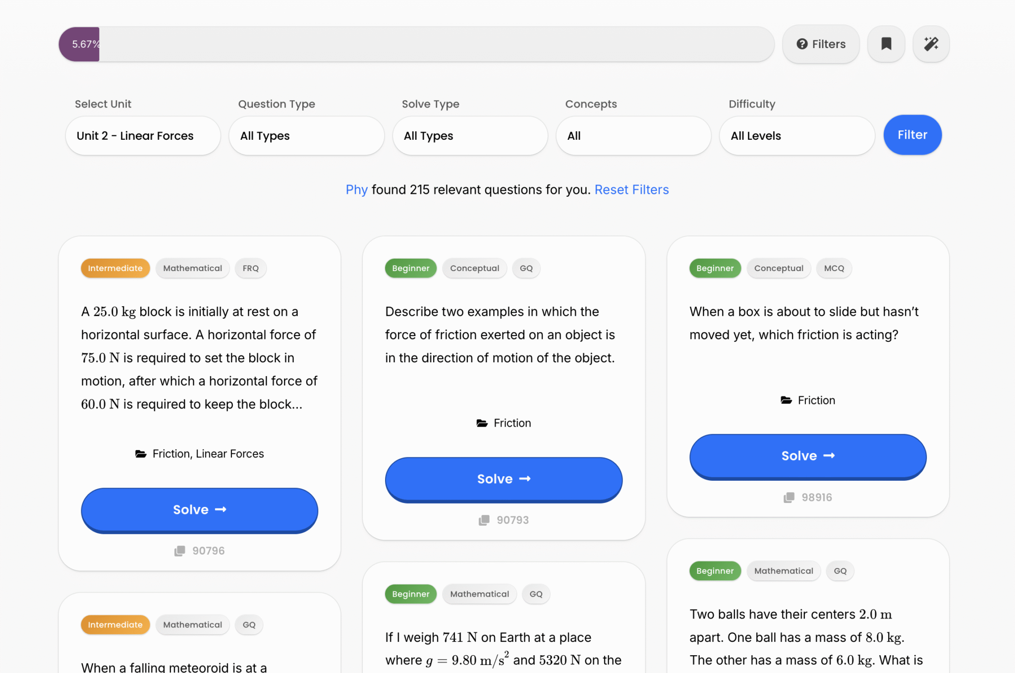 We’ve collected 1000 Physics questions from past exams to give you the best shot of acing your next exam. Focus on practicing quality questions. Get instant feedback from Phy.