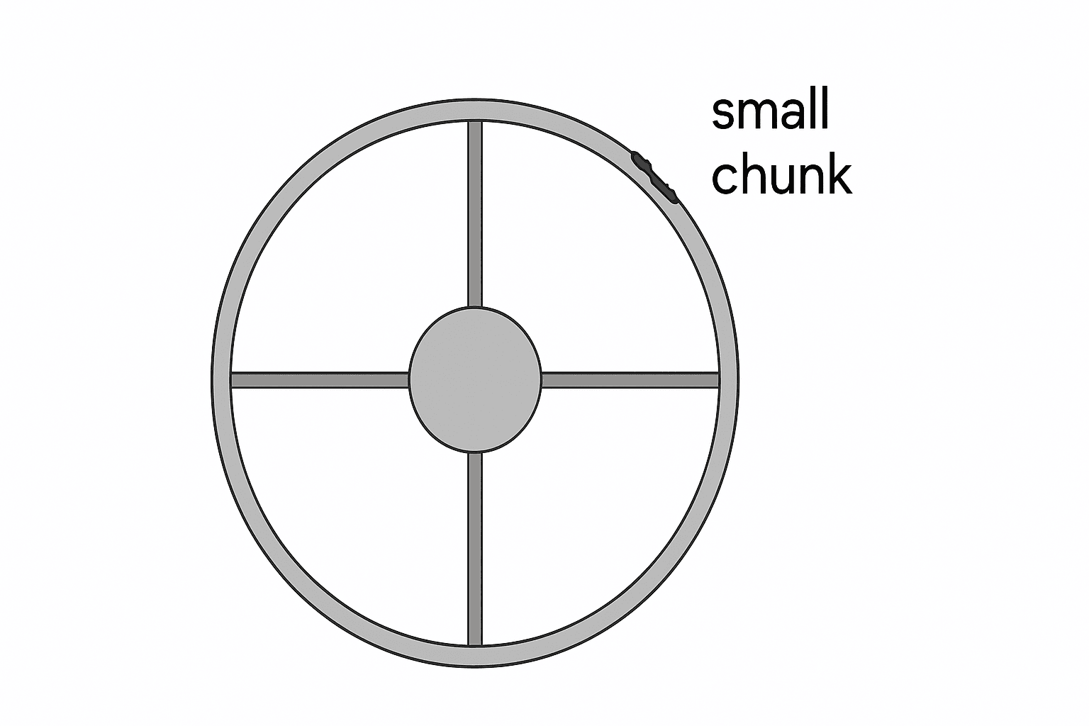 The object shown in the diagram below consists of a cylinder of mass \( 100 \) \( \text{kg} \) and radius \( 25.0 \) \( \text{cm} \) connected by four thin rods, each of mass \( 5.00 \) \( \text{kg} \) and length \( 0.75 \) \( \text{m} \), to a thin-outer ring of mass \( 20.0 \) \( \text{kg} \). A small chunk of metal of mass \( 1.00 \) \( \text{kg} \) is welded to the outer ring. Determine the moment of inertia of the entire assembly about the center of the inner cylinder, treating the metal chunk as a point mass. Hint: The moment of inertia of a disk about it center is \(\tfrac{1}{2} M R^2\), a thin rod about it center is \(\tfrac{1}{12}ML^2\), and a thin hoop about its center is \(I = MR^2\). Use only algebra and do not use “·” in your math.
