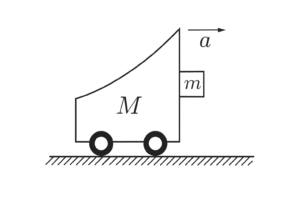 The figure above shows a cart of mass \( M \) accelerating to the right with acceleration \( a \). A block of mass \( m \) is pressed against the cart’s front vertical surface and is held there only by friction. The coefficient of friction between the block and the cart is \( \mu \). What is the minimum acceleration \( a \) of the cart such that the block will not fall?