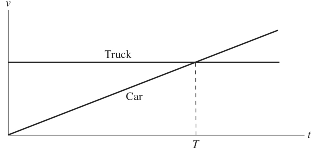 The motions of a car and a truck along a straight road are represented by the velocity–time graphs in the figure. The two vehicles are initially alongside each other at time \(t = 0\). At time \(T\), what is true of the distances traveled by the vehicles since time \(t = 0\)?